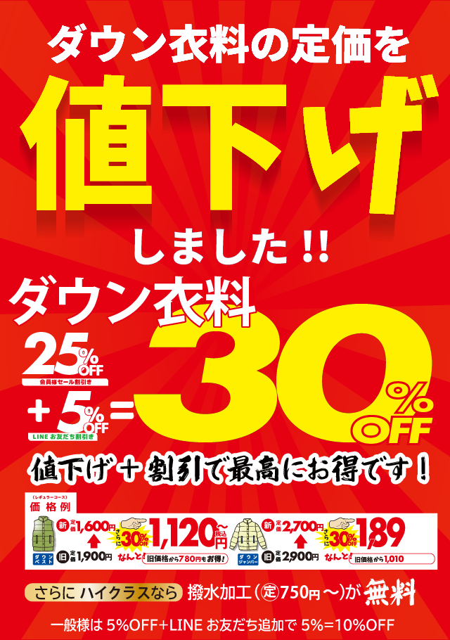ダウン衣料の定価値下げしました!