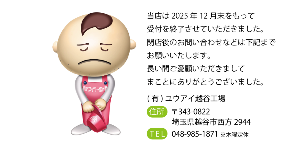 この店舗についてのお問合せ、ご意見・ご要望は問い合わせフォームまたはユウアイ越谷工場(048-985-1871)へお願いいたします。